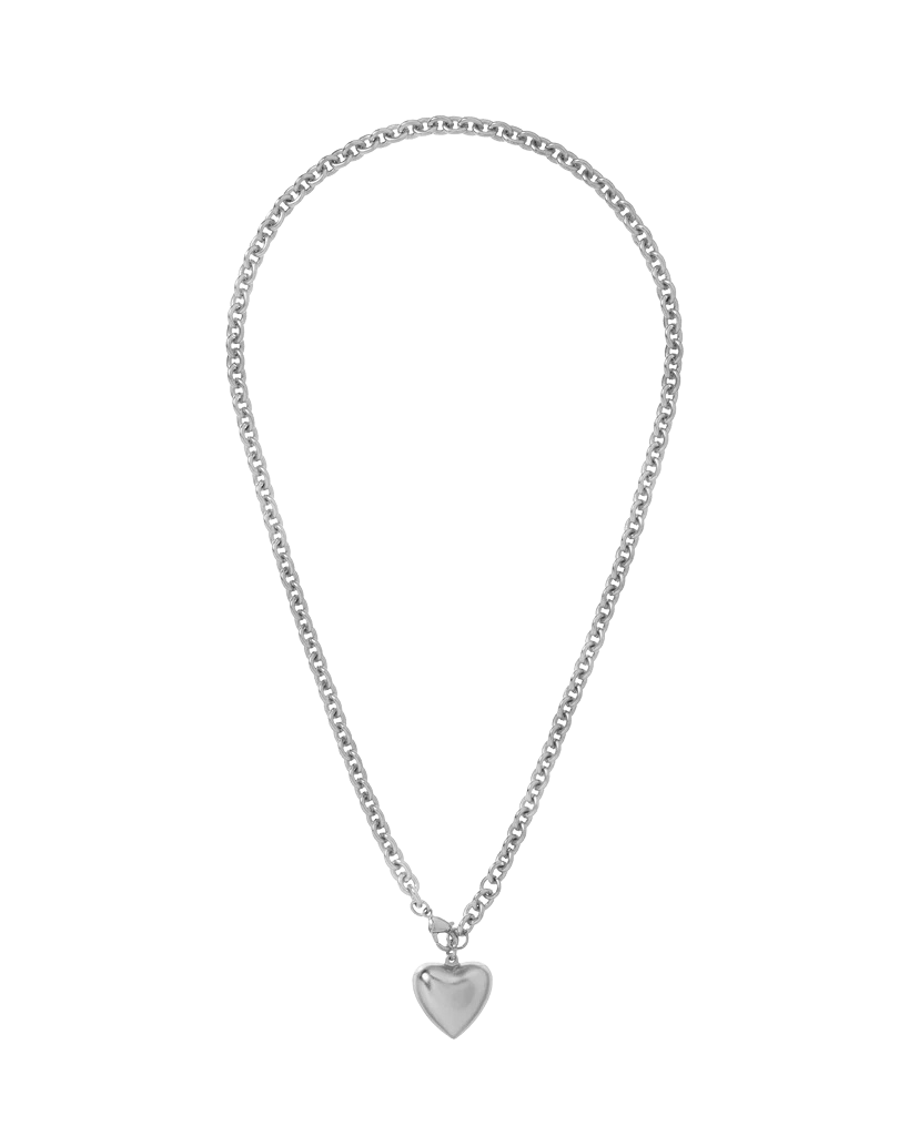 Amour is an extra long over sized Rolo Chain that can be worn wrapped or as a Lariat. The 1.5" Full Puffy Heart makes a playful statement.