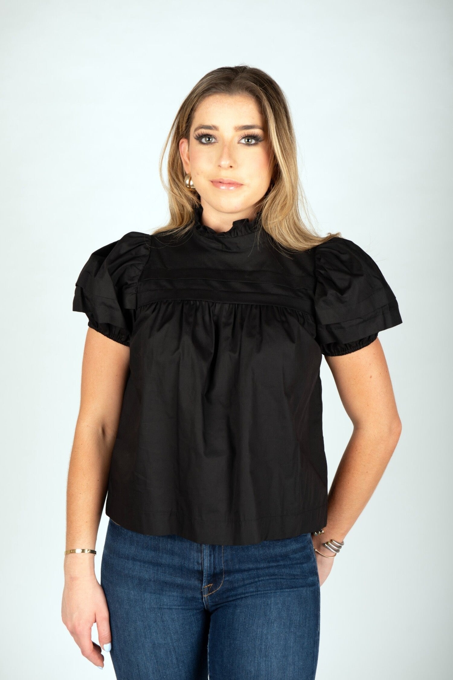 Brody top; short sleeve black top, pleated yoke, boxy fit