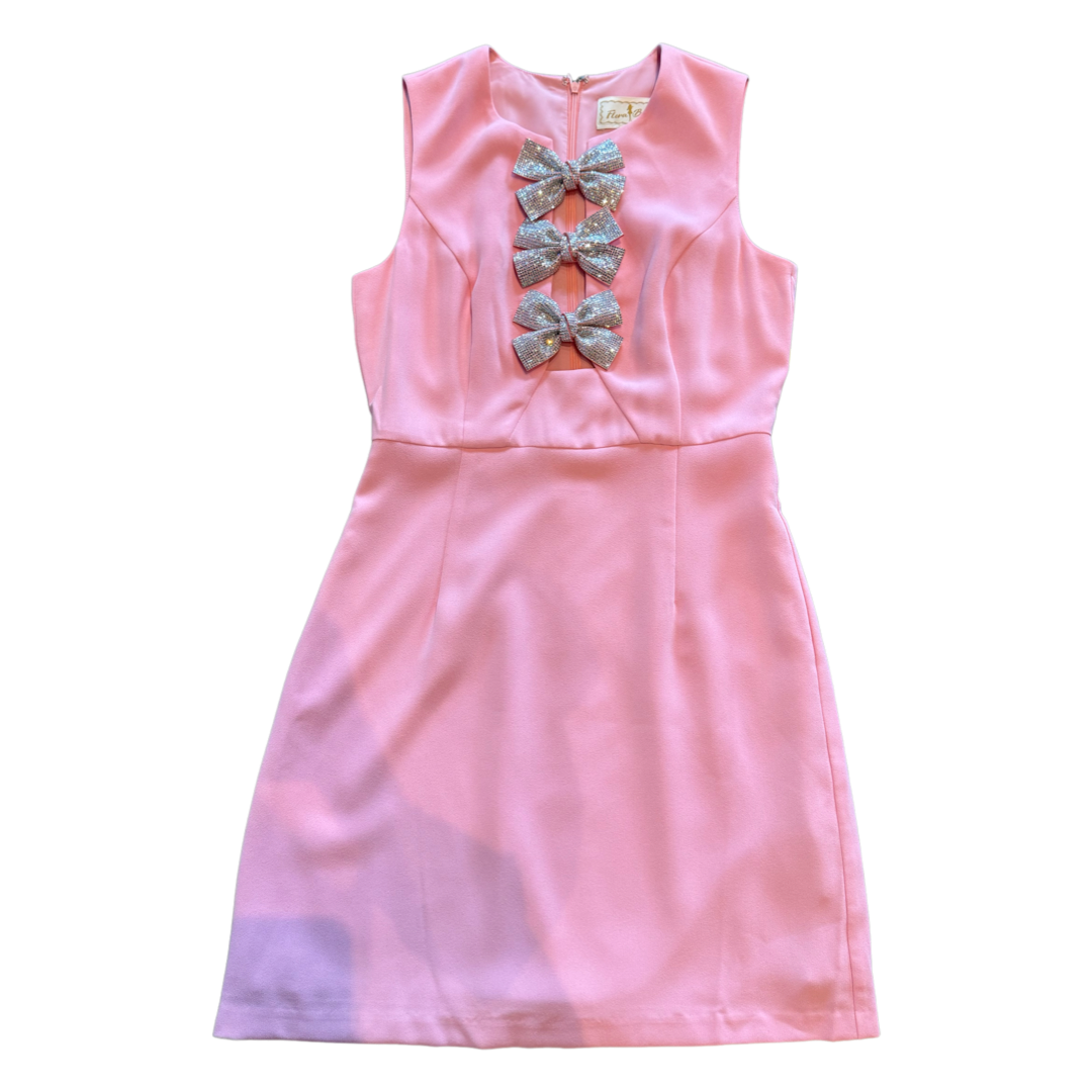 Flora Bea: True to size shift dress with zipper back and rhinestone bow detail.