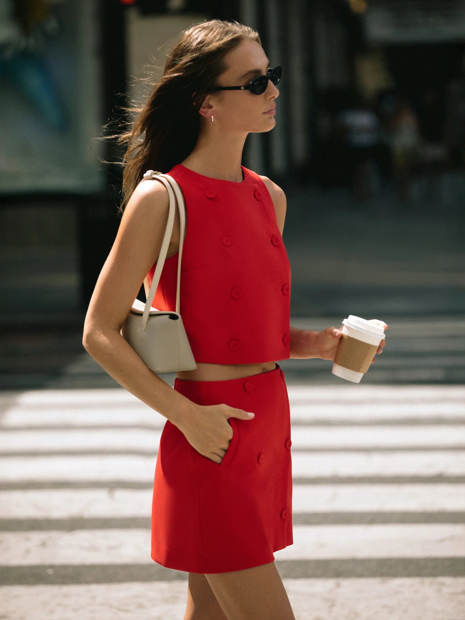 The Azra Twill Double Breasted Mini Skirt is the kind of mini that means business. Designed with an A-line silhouette, functional side pockets, and a double-breasted button detail, it’s equal parts polished and playful. Style it with the Azra Twill Double Breasted Top, or keep it casual with your favorite tee.