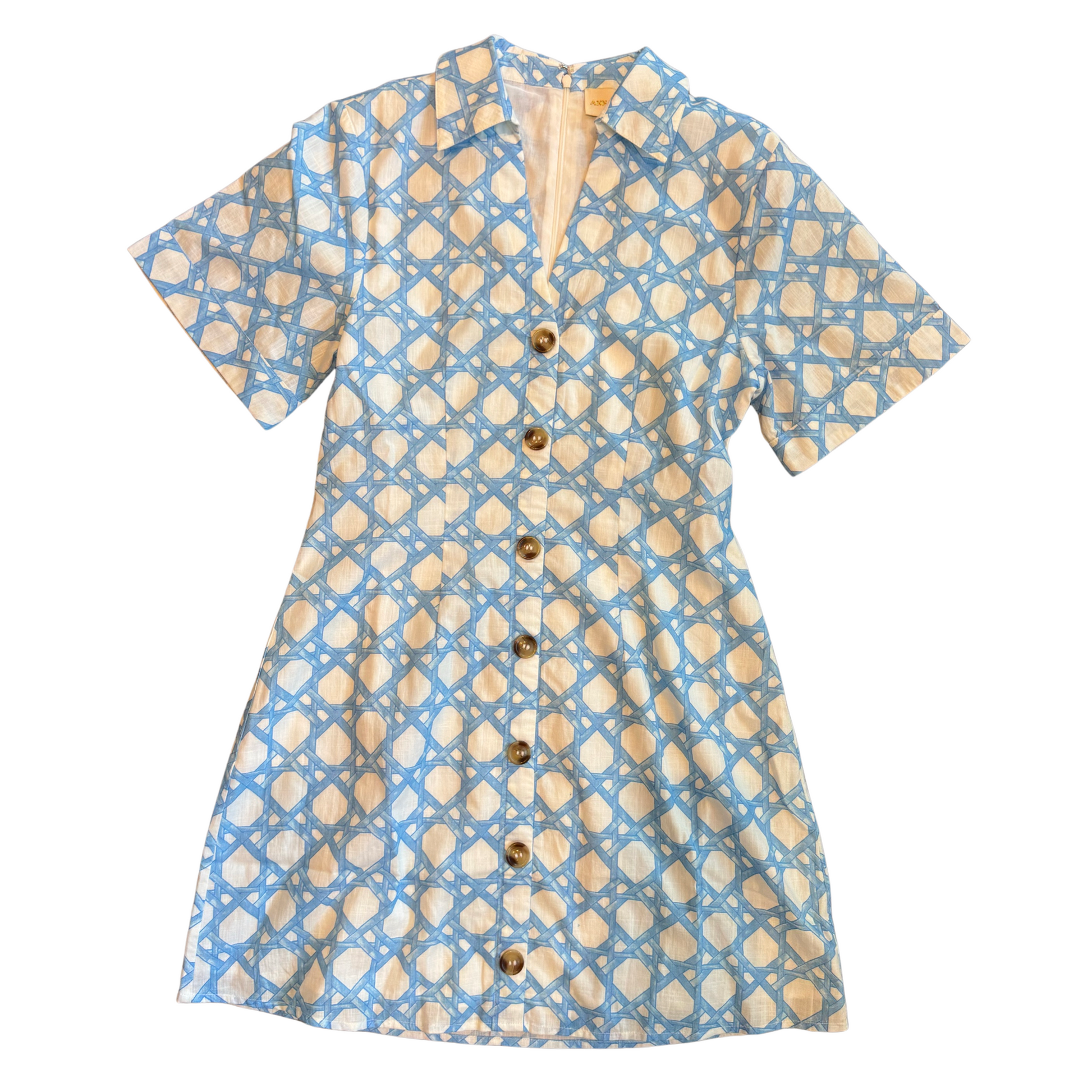Anna Cate Drew dress in light lbue trellis. Luxe linen blend material, fitted waist, runs generous.