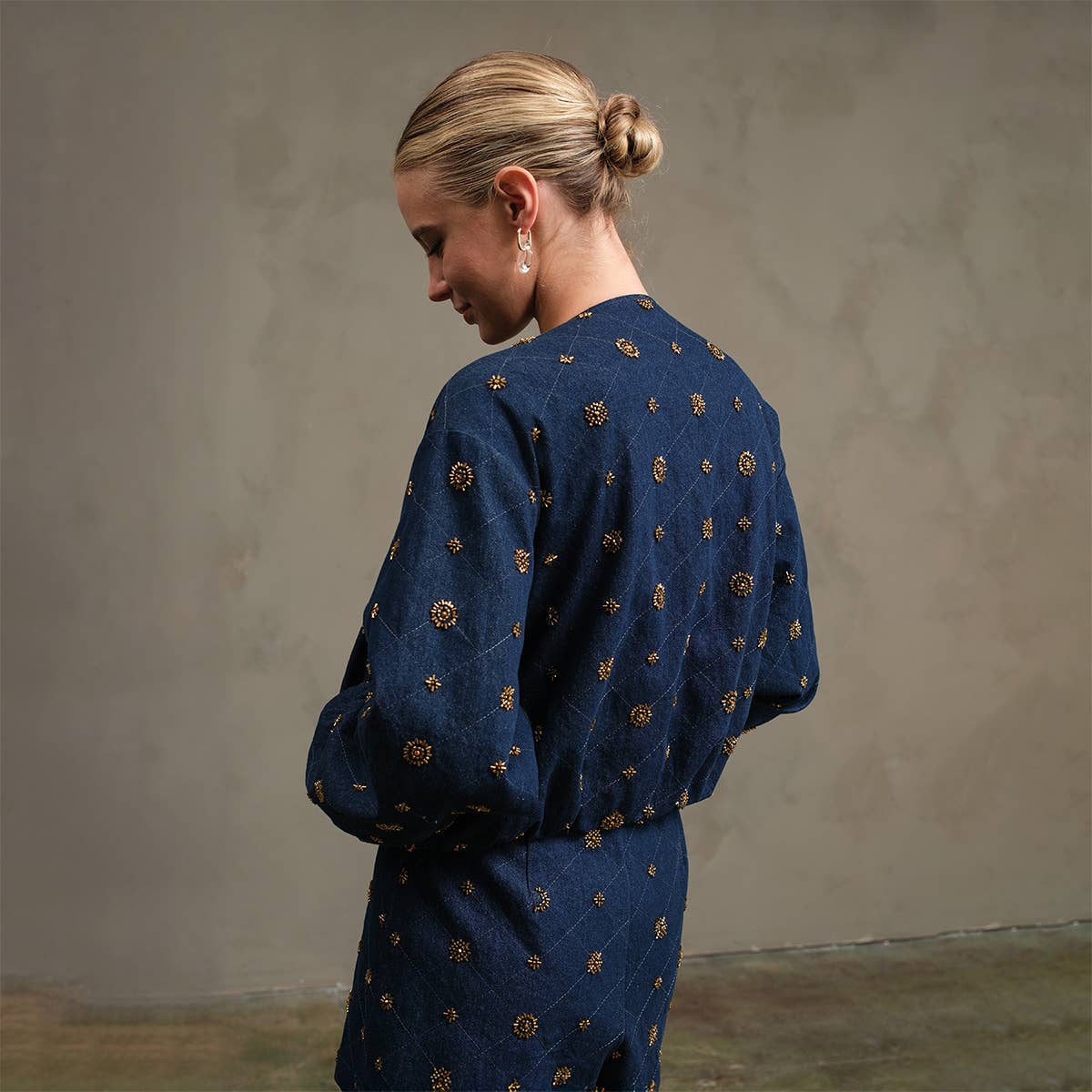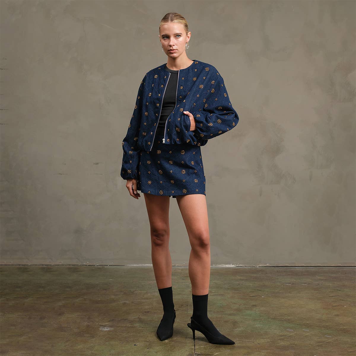 Elevate your outerwear game with this embellished quilted denim bomber.