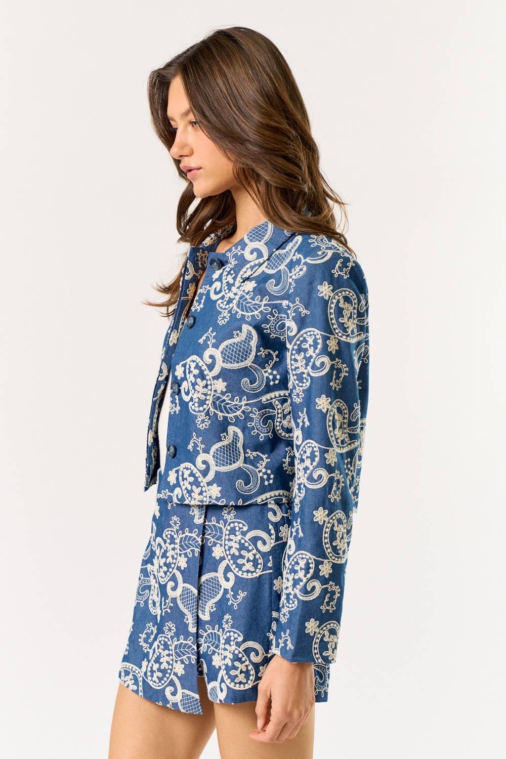 Edgy & Feminine: Floral Embroidery Button-Front Denim Jacket - Unique printed design with intricate floral embroidery - Chic cropped length for a modern, flattering fit - Delicate floral trim adds a soft, feminine touch - Classic button-front closure for easy layering - Perfect for adding a stylish edge to any outfit - A must-have statement piece for any season
