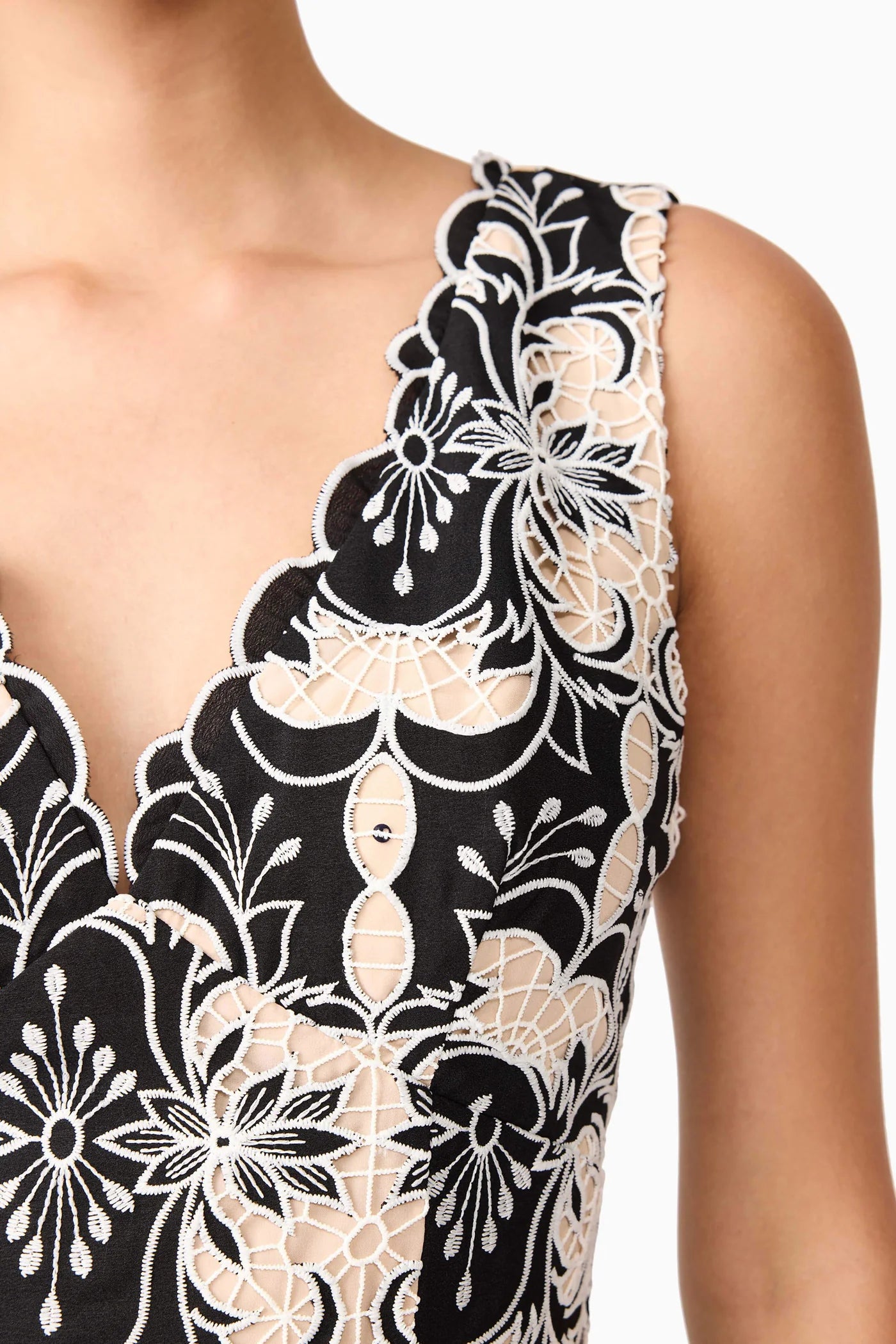 Chic and playful with an elevated edge, the Jolie Floral Mini Dress in Black is your go-to for refined femininity. This V neckline mini dress is crafted from monochrome embroidered crepe fabrication, blending classic black with soft white floral motifs for a fresh take on monochrome dressing.