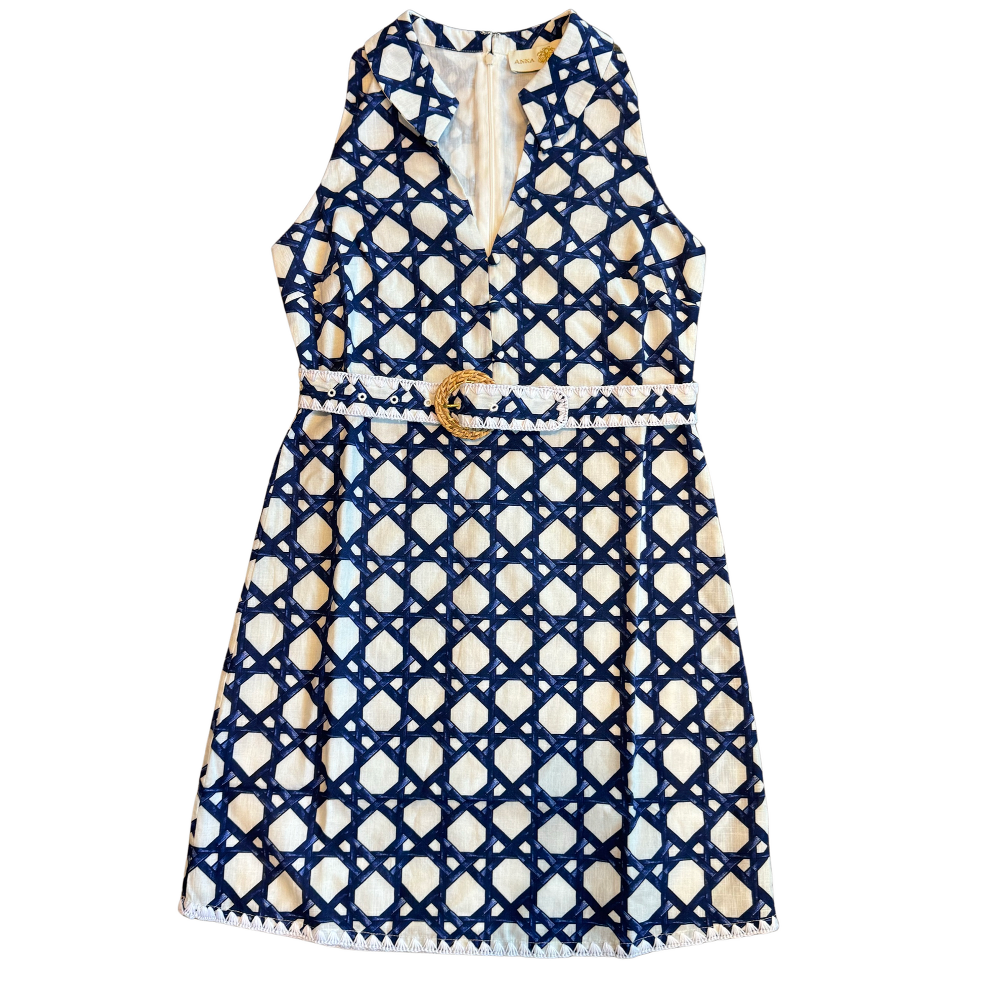 Anna Cate Kaylee dress in navy trellis, luxe linen blend material. Runs generous,