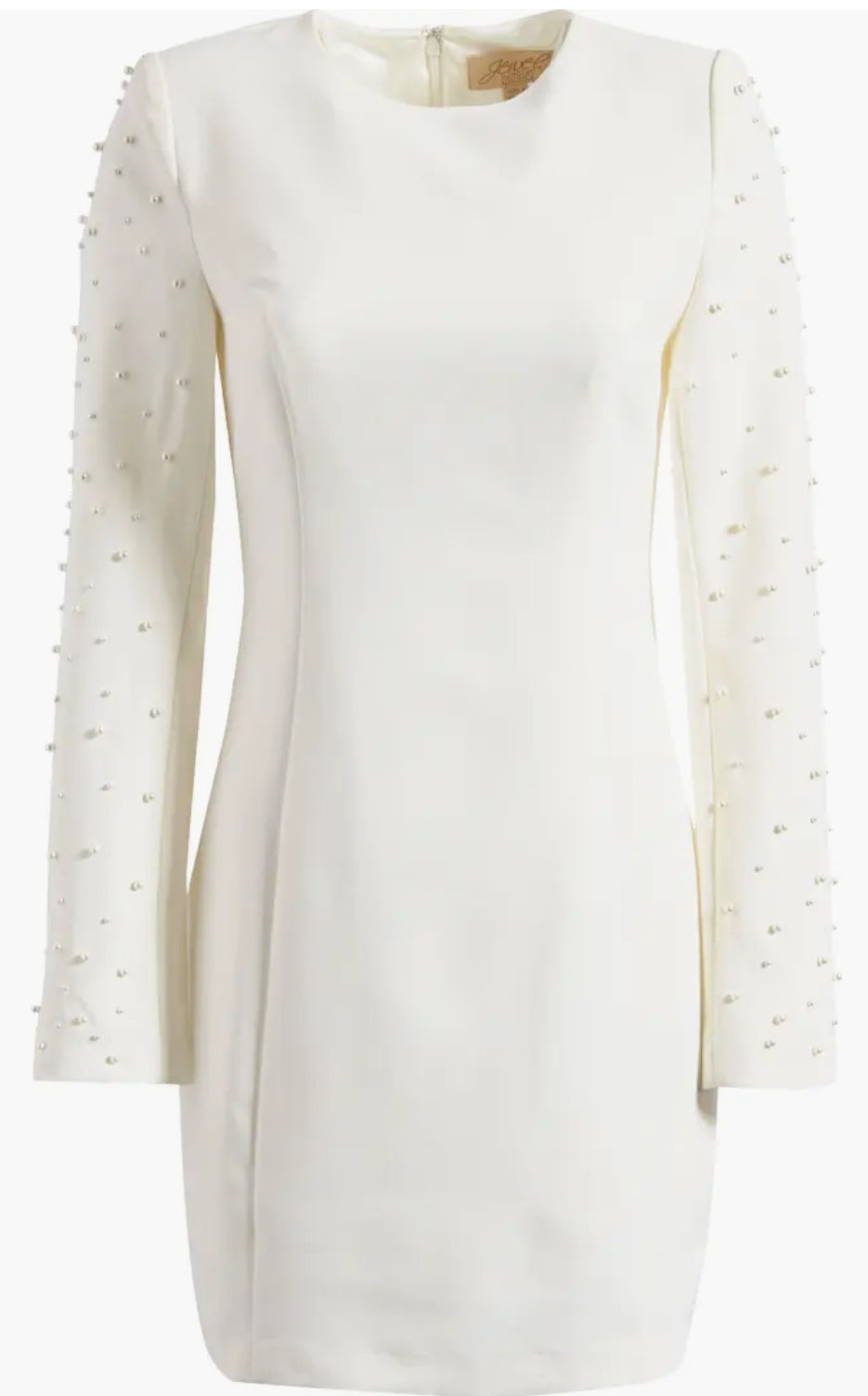Jewel by Badgley Mischka; long sleeve ivory dress with pearl studded sleeves
