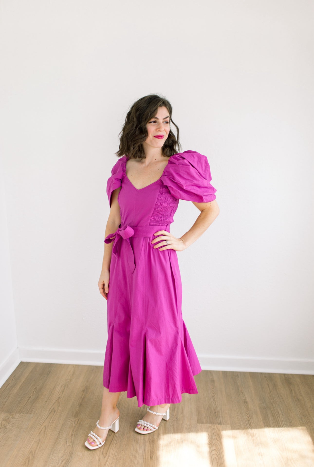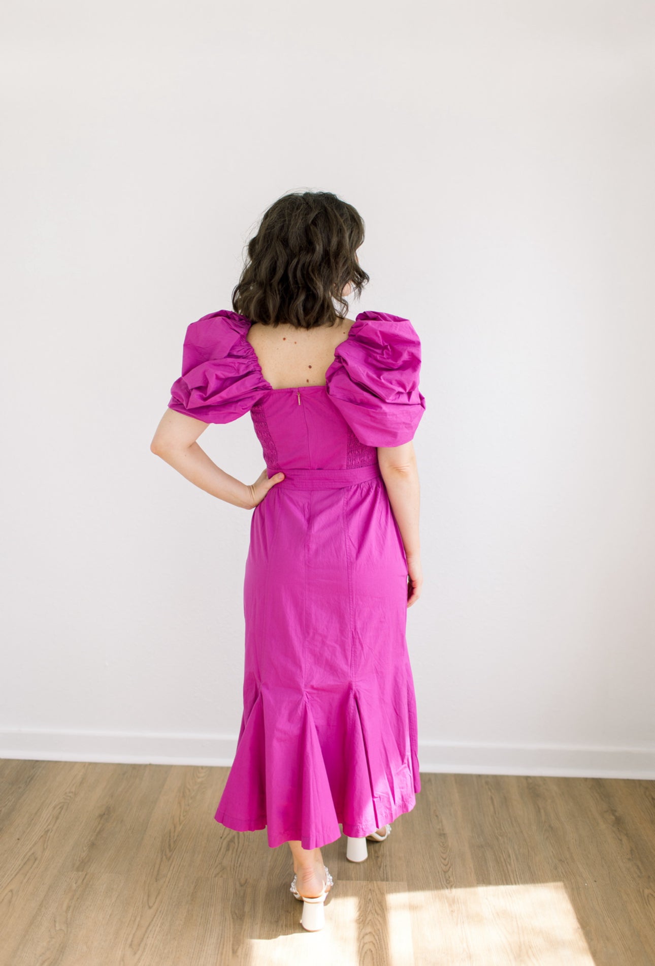 Cleobella - In organic cotton, the Malina Midi Dress features voluminous puff sleeves that tuck into its sweetheart neckline for a waterfall effect. Fitted bodice flows into a flared skirt with godets for added drama.