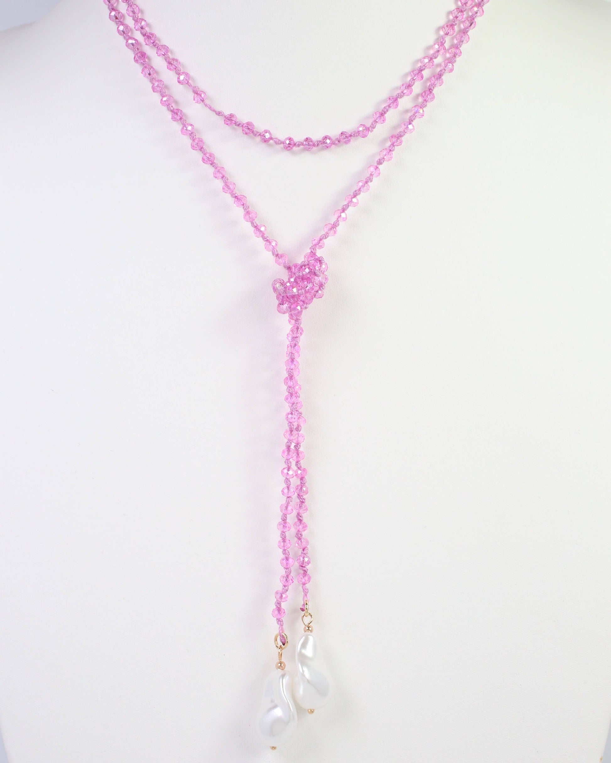 Energize your jewelry collection with this stunning long beaded necklace, featuring delicate knotted pink beads that create an ethereal, layered aesthetic. The piece is finished with luxurious baroque pearl ends that add sophistication and organic texture. Perfect for layering or wearing solo, this necklace transitions seamlessly from casual daytime elegance to evening glamour. The extended length offers versatile styling options, draping beautifully against any neckline. An investment piece that combines contemporary design with timeless pearl appeal.