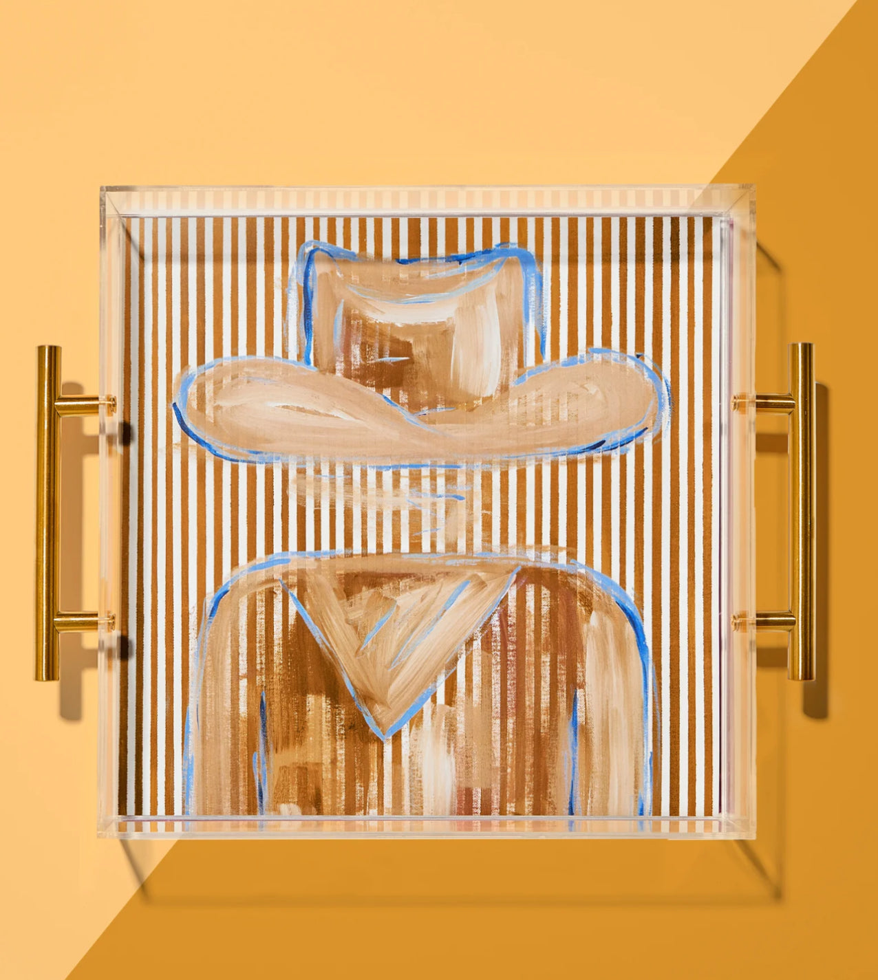 Saddle up with the Outlaw Large Tray! This acrylic tray features a bold stripe cowboy painted by Emma Katherine, perfect for adding a touch of character to any space. Round up your friends and serve drinks or snacks in style with this unique tray. Giddy up!