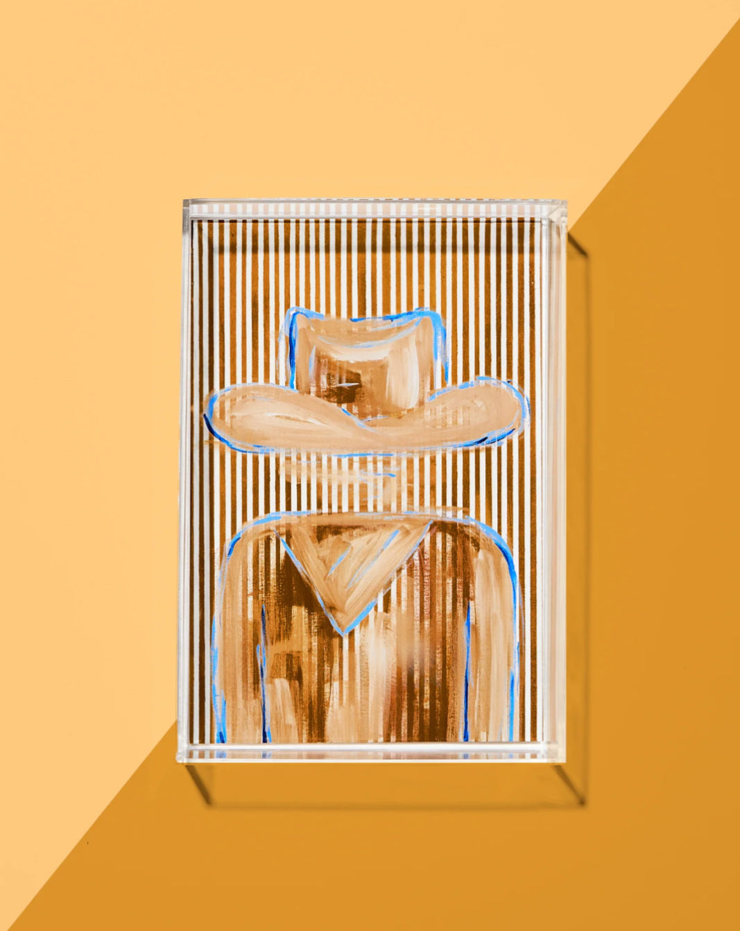 Saddle up with the Outlaw Small Tray! This acrylic tray features a bold stripe cowboy painted by Emma Katherine, perfect for adding a touch of character to any space. Round up your friends and serve drinks or snacks in style with this unique tray. Giddy up!