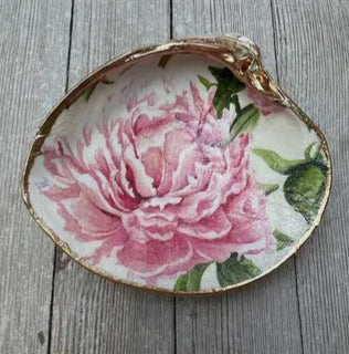 Hand painted and decoupaged real clam shell. Perfect as a gift, for a vanity or nightstand,