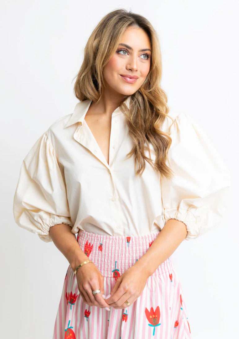Karlie: balloon sleeve cream top, full length with longer back. True to size, boxy fit