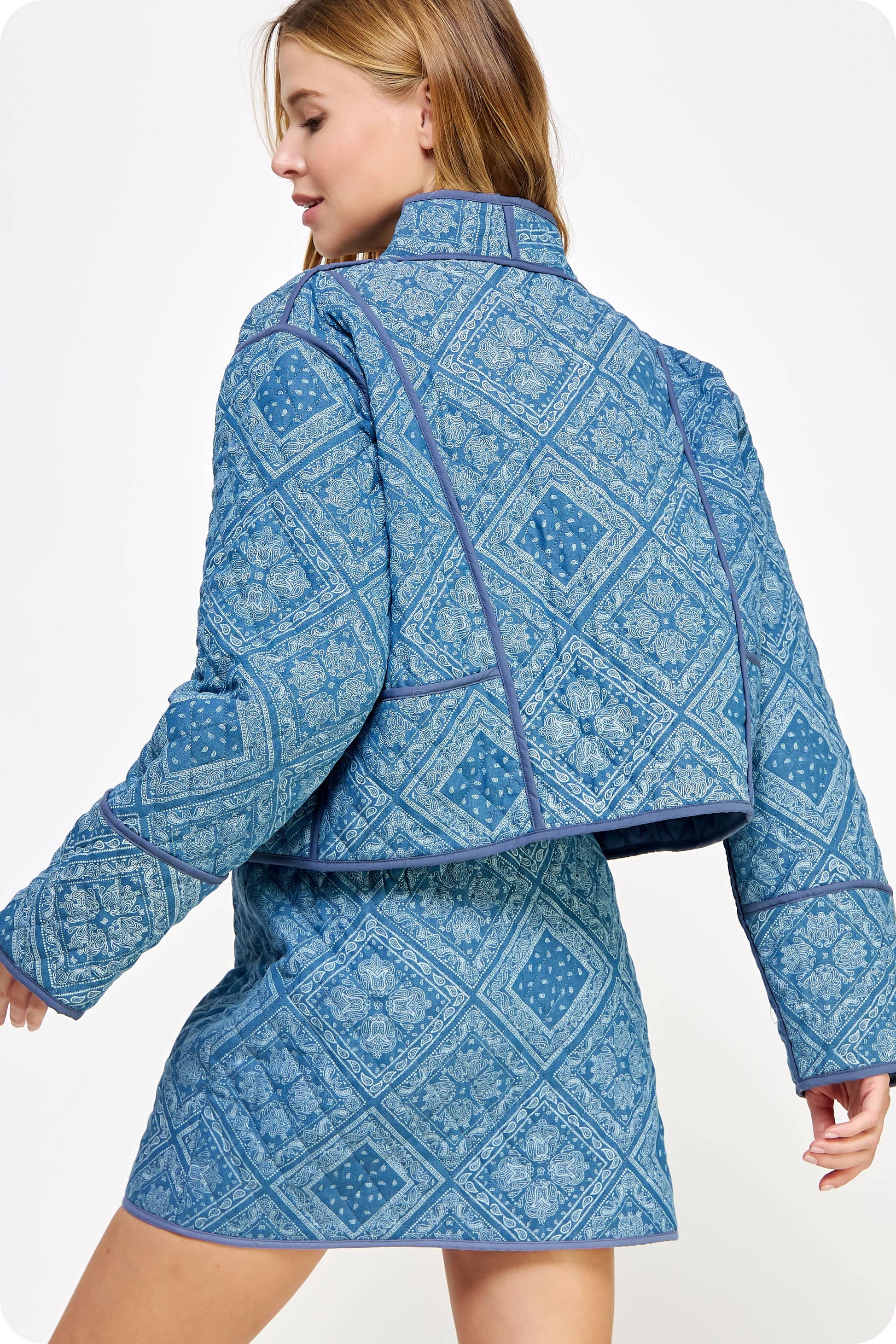 Padding quilted piping detail jacket in an exclusive print on cotton woven fabric. This oversized padded jacket features all over quilting, contrast piping detail throughout, long sleeves, and dropped shoulder.
