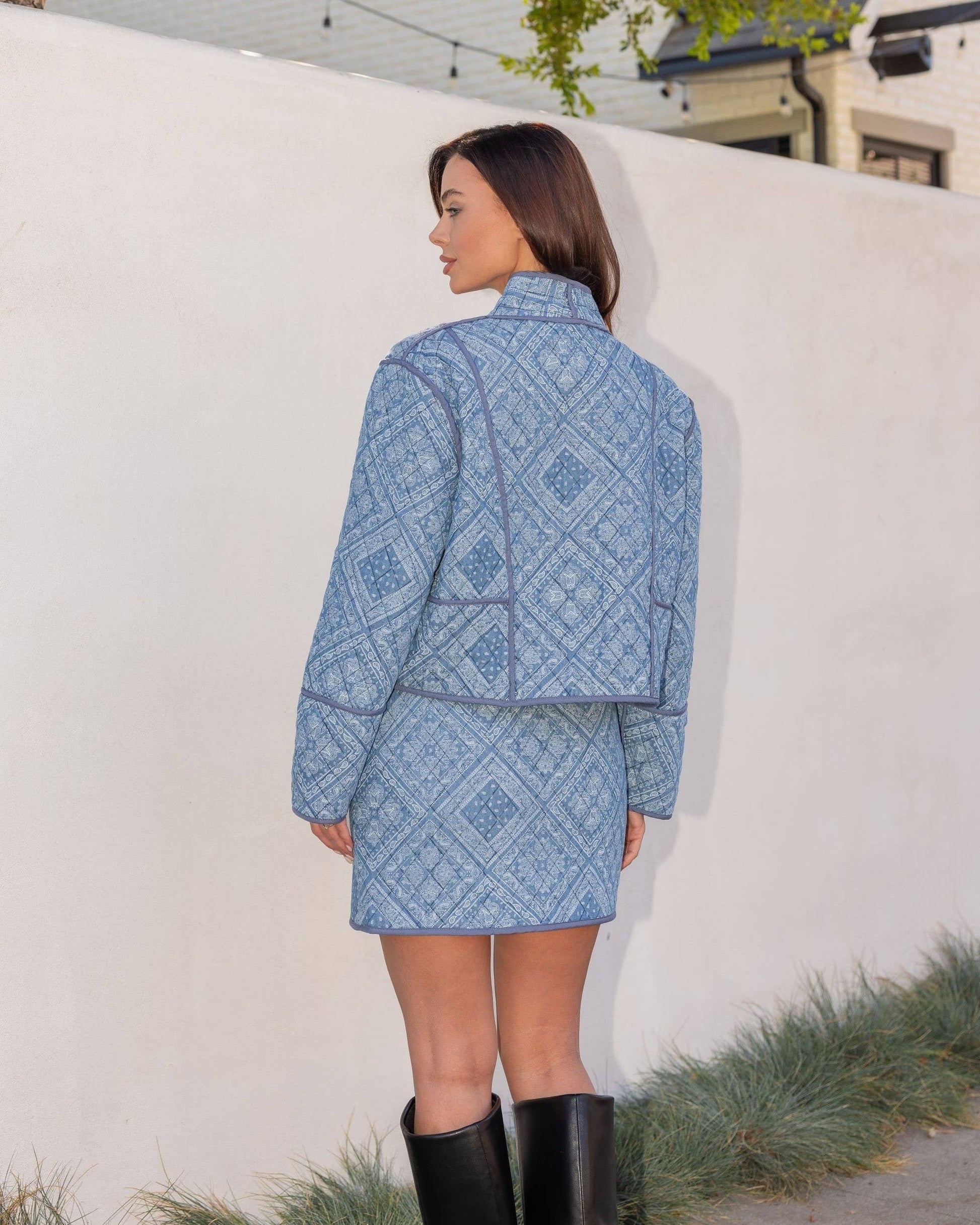 Padding quilted piping detail mini skirt in an exclusive print on cotton woven fabric. This mini skirt features all over quilting, contrast piping detail, and exposed zipper closure at front.