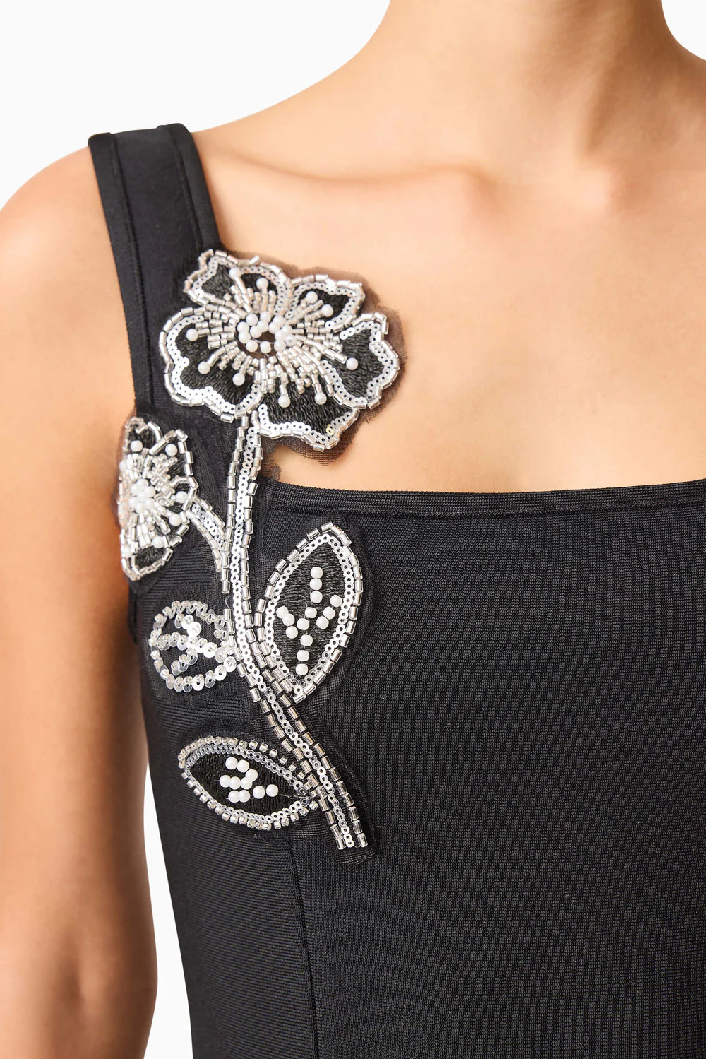 Floral detailing along the neckline adds a romantic twist, contrasting beautifully with the structured shape and deep black tone. This dress transitions seamlessly from casual daywear to an elevated evening look with just a change of accessories.