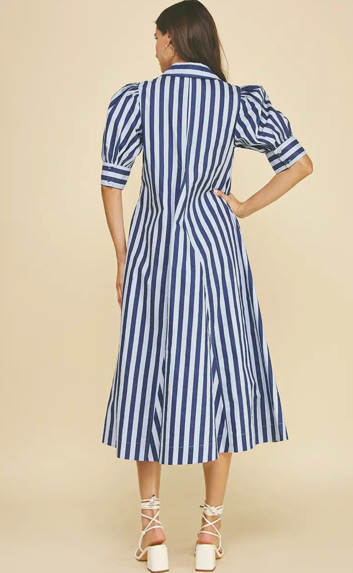 Flost collared shirt dress, true to size. Bold cabana stripe, so cute with sneakers for running around.