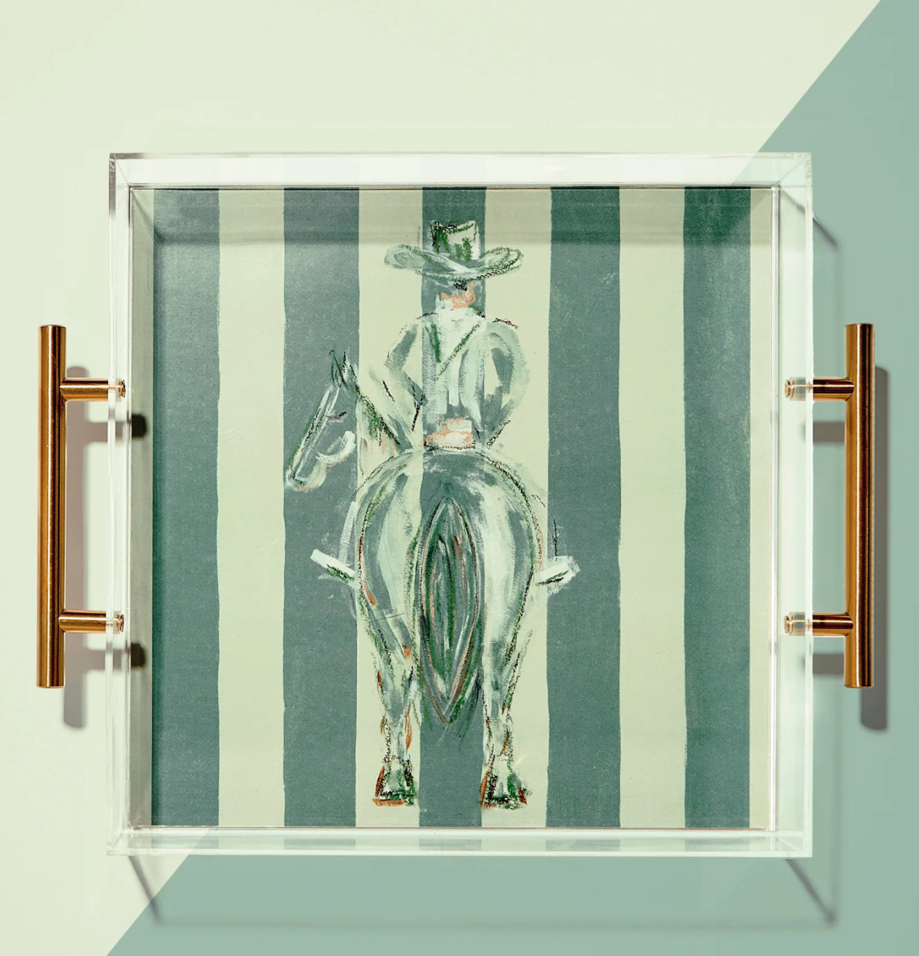 Add a touch of wild west charm to your space with our Trailblazer Large Tray. This acrylic tray features a striking cowboy in green, hand-painted by the talented artist Emma Katherine. Perfect for storing your essentials in style. Saddle up and get yours today!