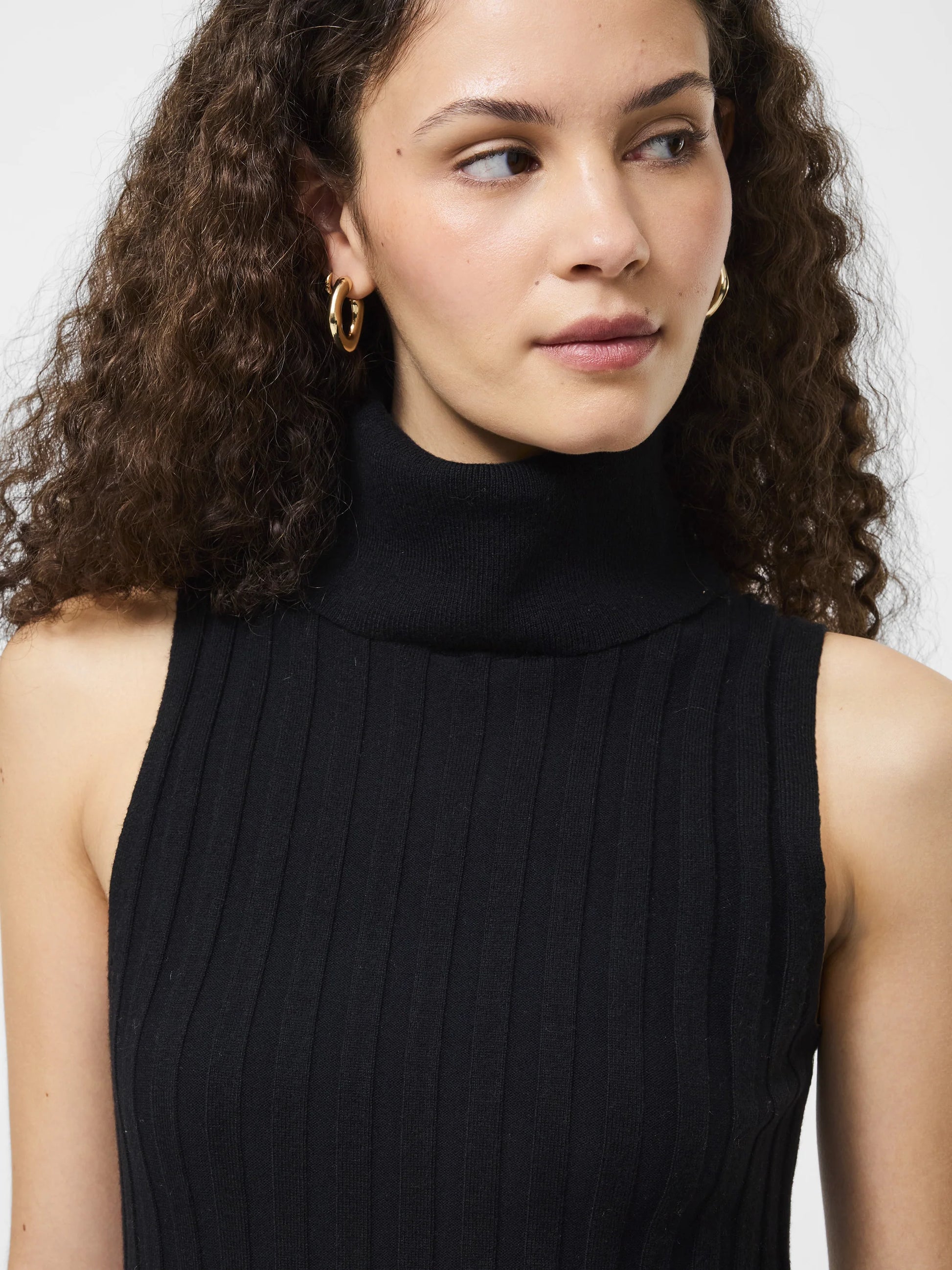 The Turtleneck Tank Sweater is sleek, sculpted, and made to stand out on its own. With an allover wide rib and a high turtleneck, this sleeveless knit hugs the body for a flattering, modern fit that’s anything but basic.