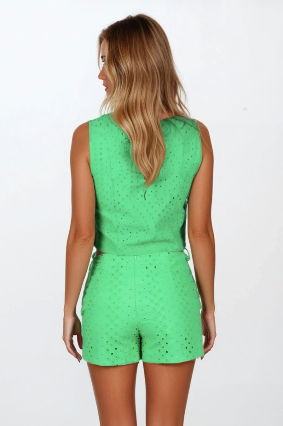 Violet tank in green eyelet, slightly cropped fit. If between go up.