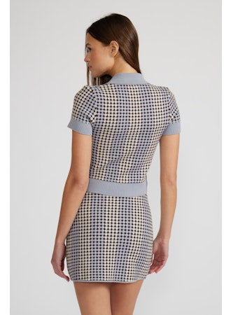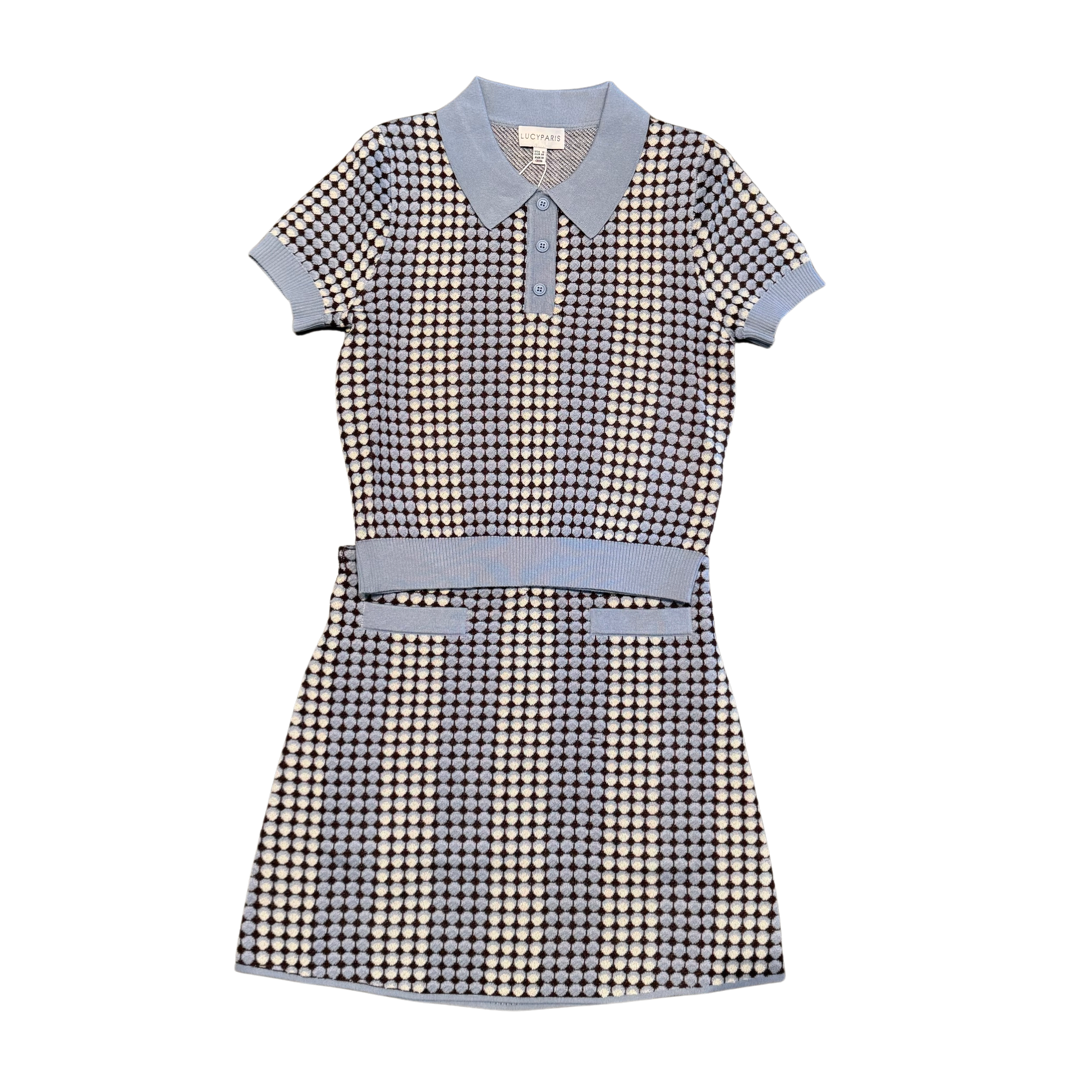 Lucy Paris: Vivian knit top in blue geometric pattern, fitted, if bereeen size up. Wear alone or as a matching set