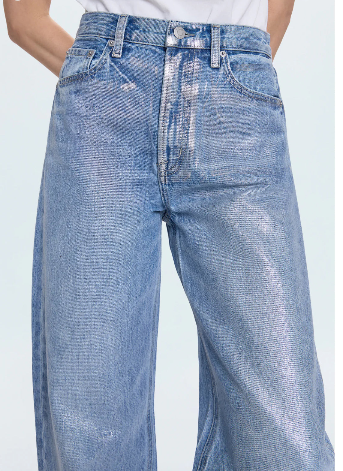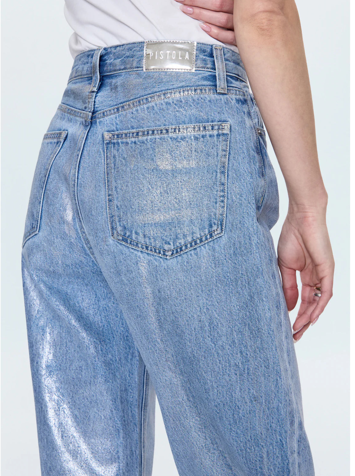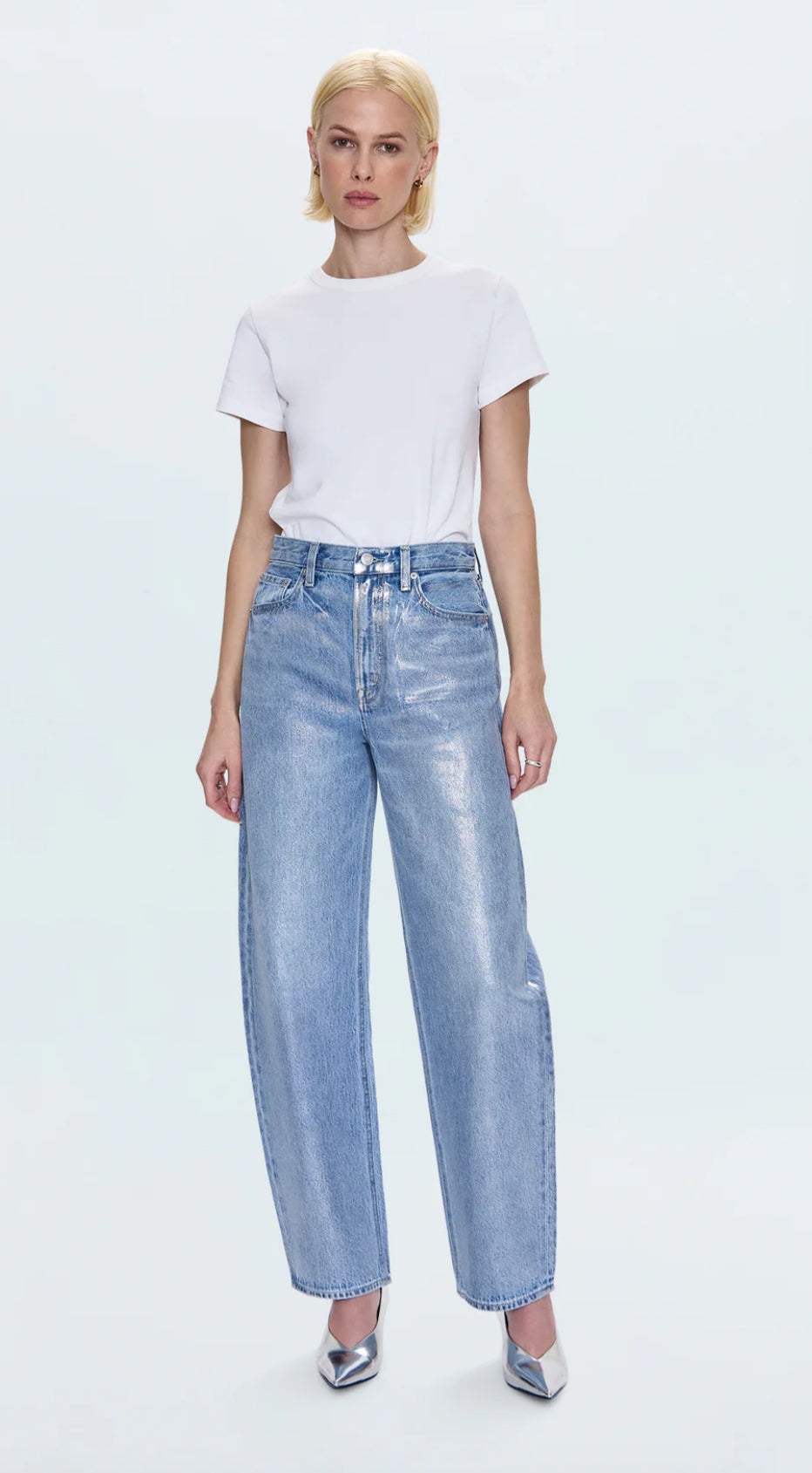 Silver screen coated denim, barrel fit, size down one or 2 for a better fit.